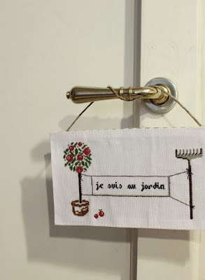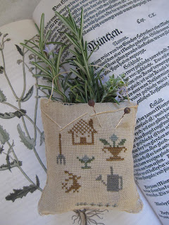 Puisque l'heure est au jardin ........ Un petit message d'absence brodé et sa petite grille en cadeau .. Un style * MEDICIS * pour des sachets/senteurs Lavande.... Grille brodée avec du fil DMC vert